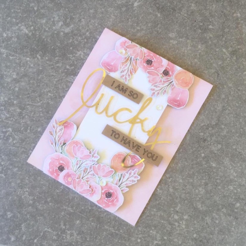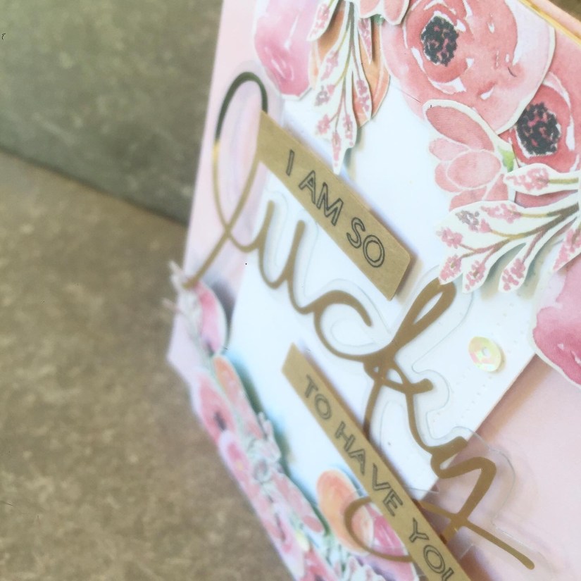 I love to see florals on cards. When I first saw these flowers in 2017, I knew I would be fussy cutting them for a project someday. Approximately 3 years later I have finally gotten around to it. The subtle pink and peach tones are so feminine and beautiful and remind me of a beautiful spring morning. The florals I used are from the DCWV Copper Luxury Stack which you may purchase on amazon.