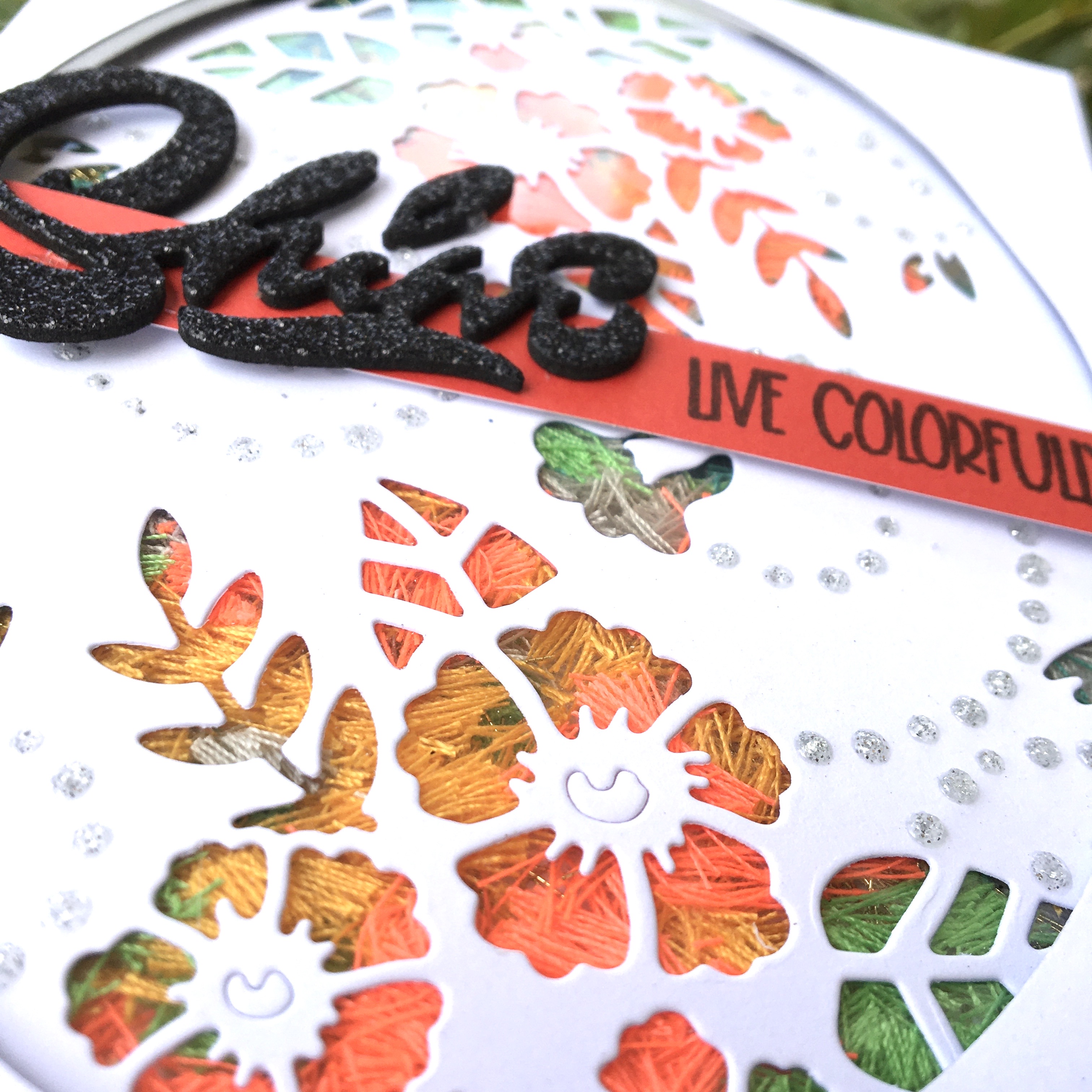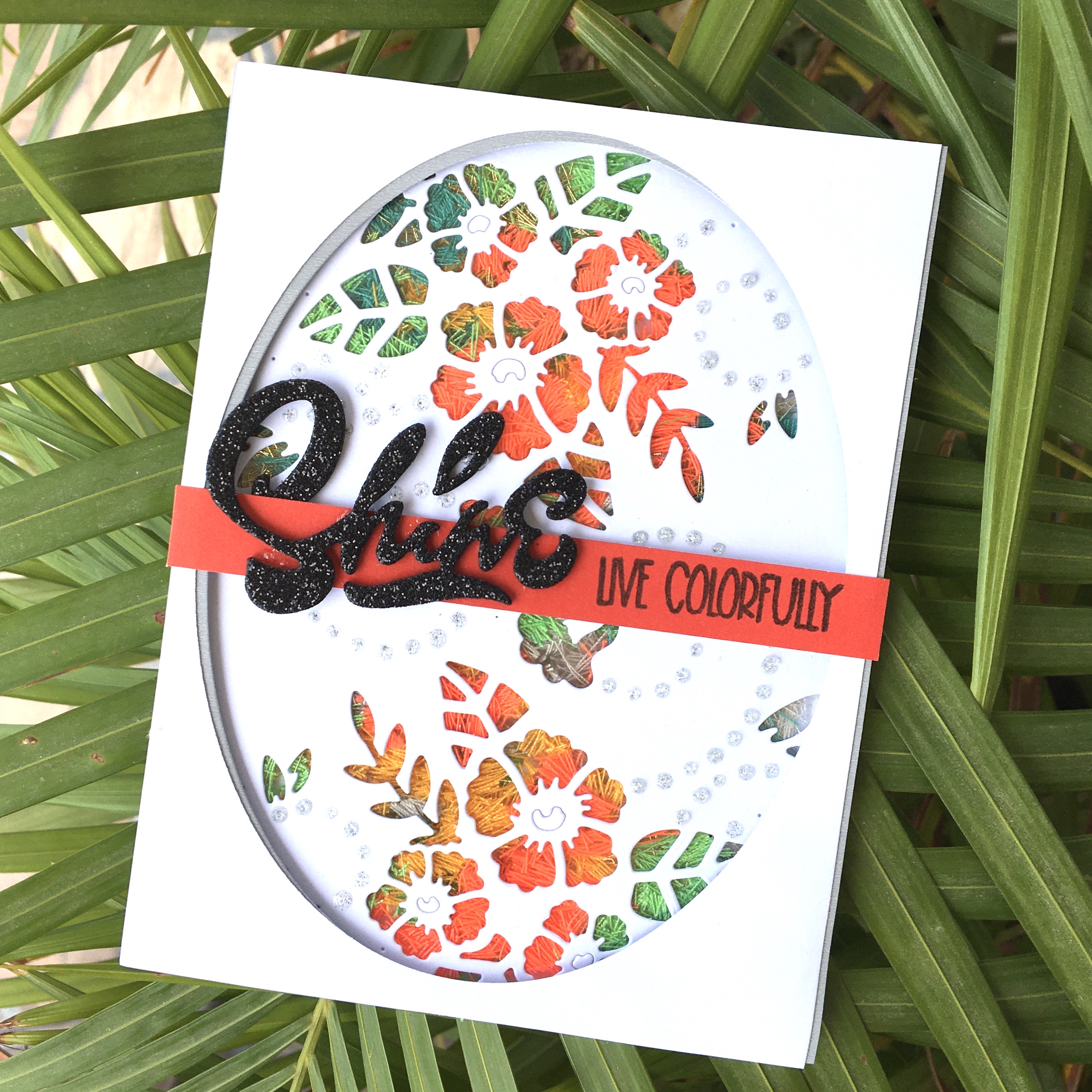 - After nuvo drops have dried, cut the shine sentiment from black glitter foam ( why don’t I always use glitter foam for all my sentiments 🙌, it is the perfect amount of dimension in one cut without having to stack 3 or 5 layers of paper. I think I’ll be using foam from now on for sentiments ).