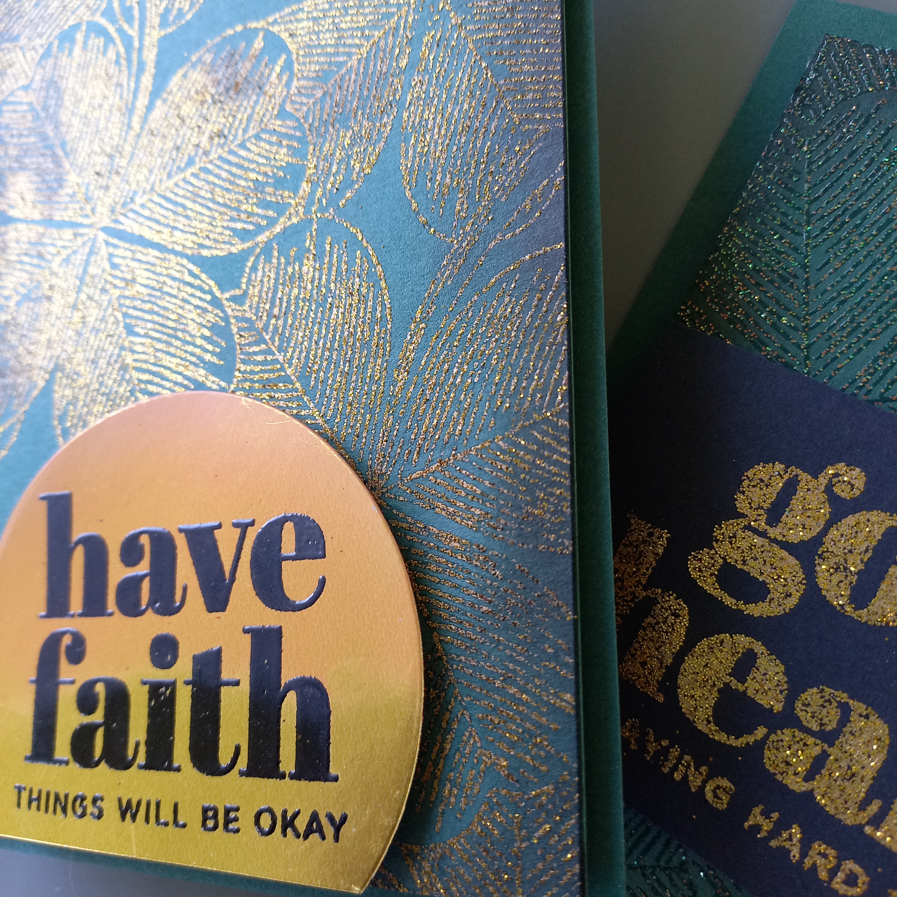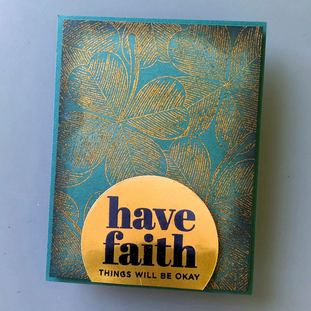 - Align gold circle on gold embossed card panel just so the sentiment is just above the edge. Adhere with foam tape and cut the excess circle off.