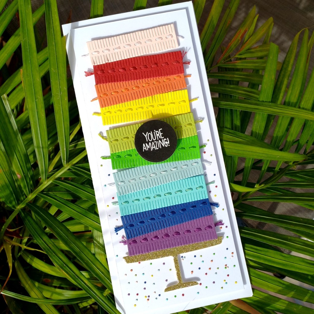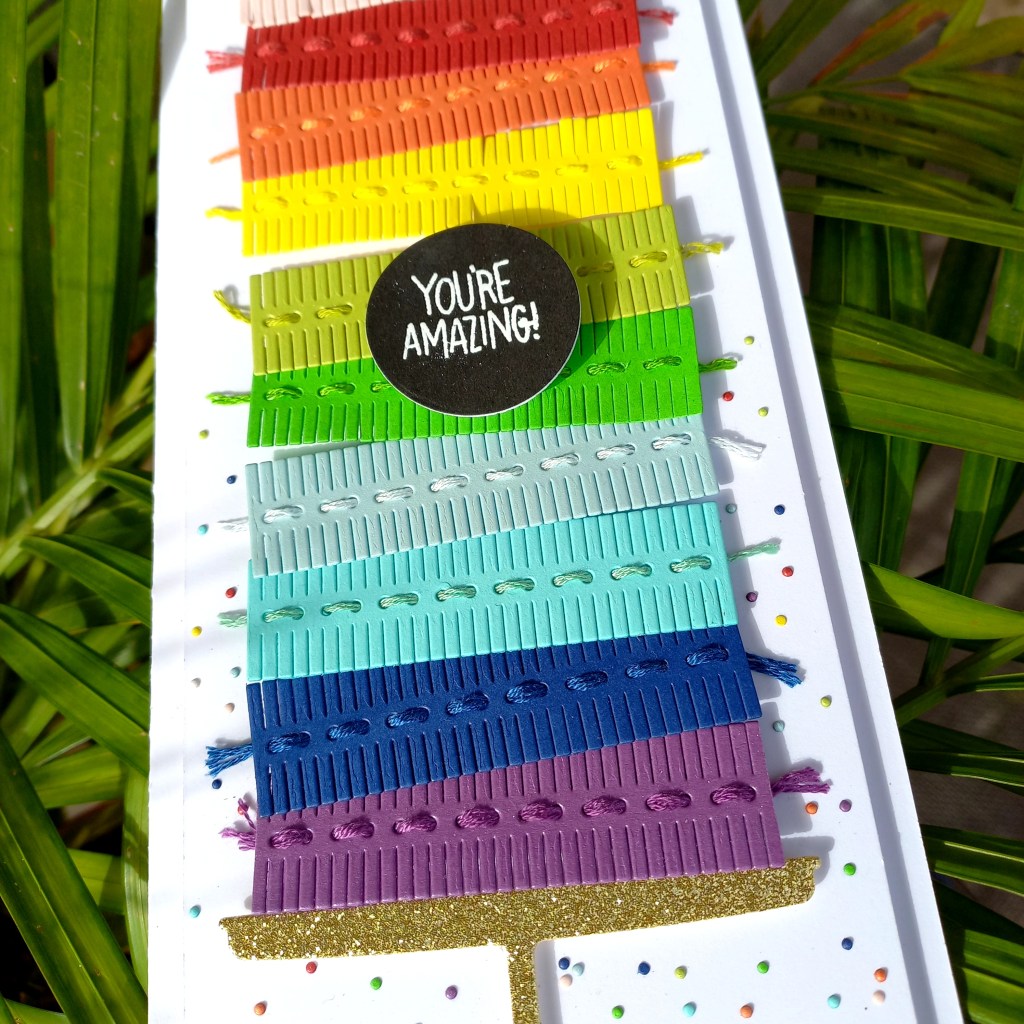 Here’s how I made this topsy turvy rainbow cake card (which I am so in love with!) using supplies from the new Spellbinders Paper Arts Birthday Celebration Collection. There is so much awesomeness in this collection but when I saw this Stitched Fringe Cake die set I knew I had to bring this cake to life.
