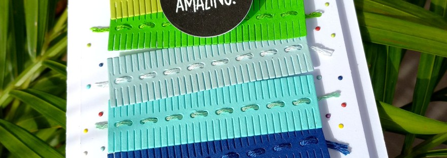 To begin, I cut the fringe portion of the die set from different colors of plain and metallic cardstock. I saved the tiny dots that came out with each die cut to use for confetti later on. I used 3 strands of floss in coordinating colors to stitch each piece. I added a thin strip of foam tape just behind the stitching.
