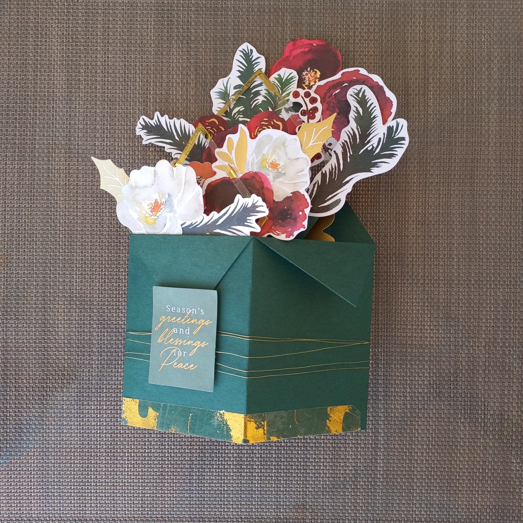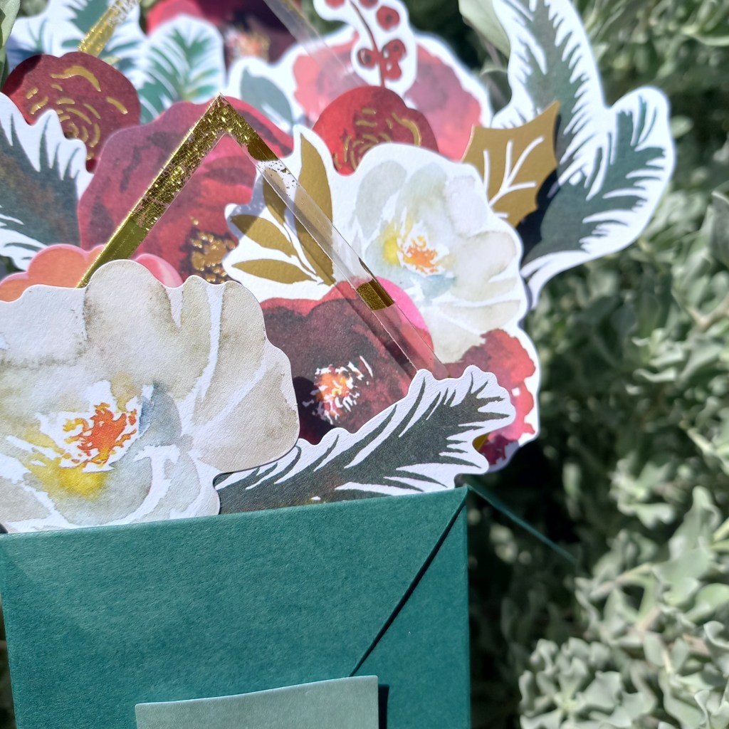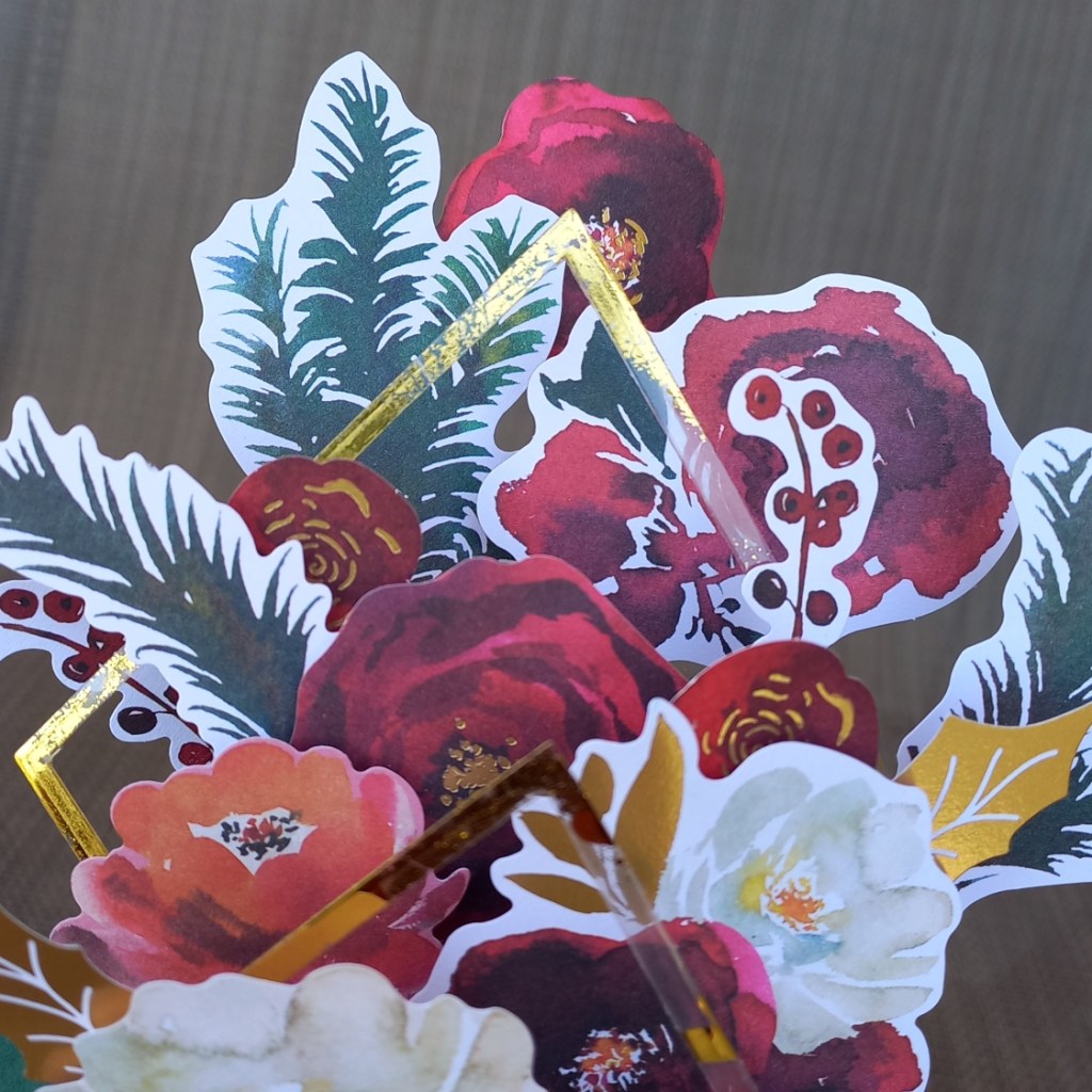 - Choose your favorite flowers and ephemera from the Santa Lane Floral Die Cut Shapes and glue to the panels inside the box. You can also stick flowers on top of one another with foam tape to give dimension.