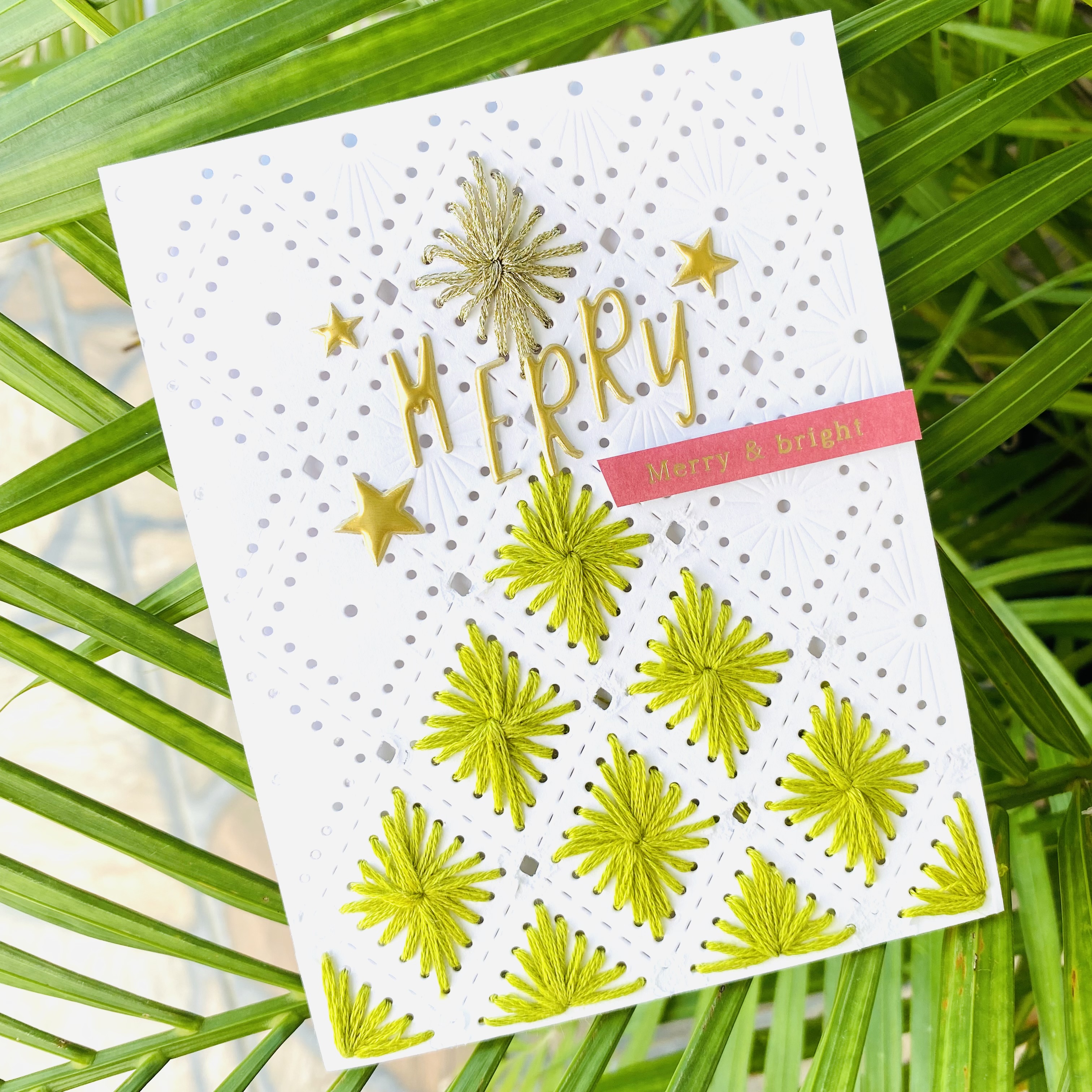 For the first card I created a christmas tree design on the front panel after cutting the die from white cardstock. A fun way to use these stitching dies is to find the hidden shapes outside of the apparent design and highlight these shapes.