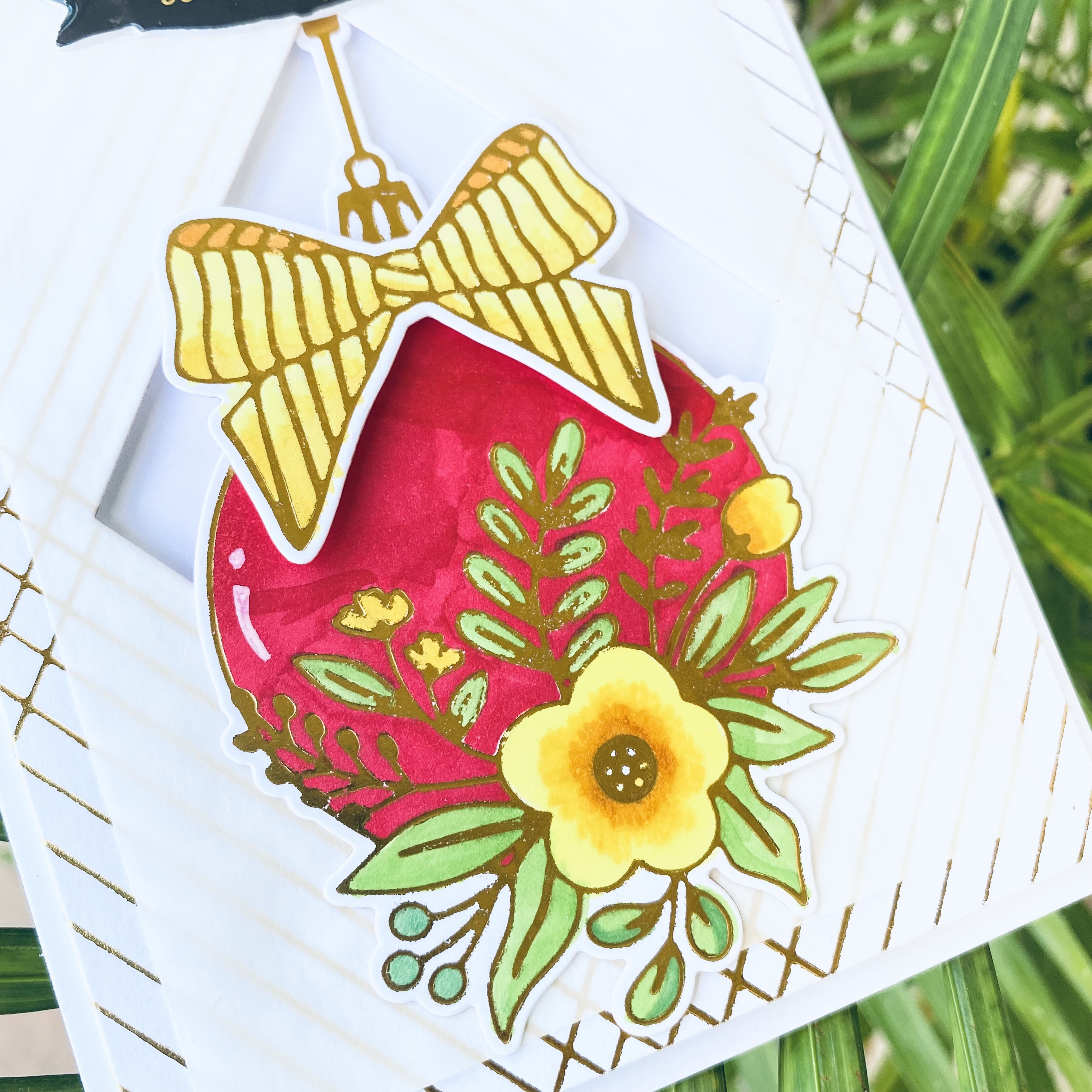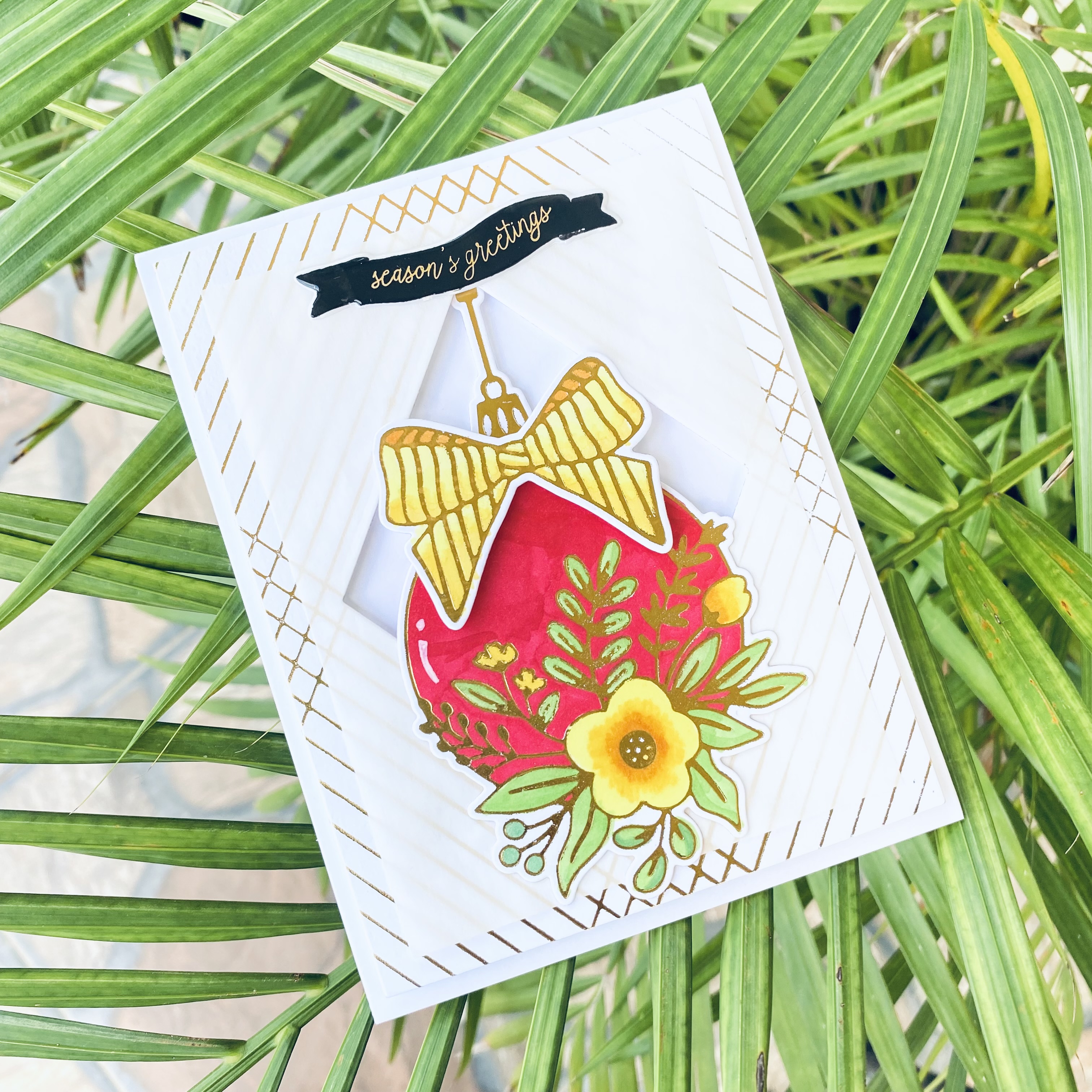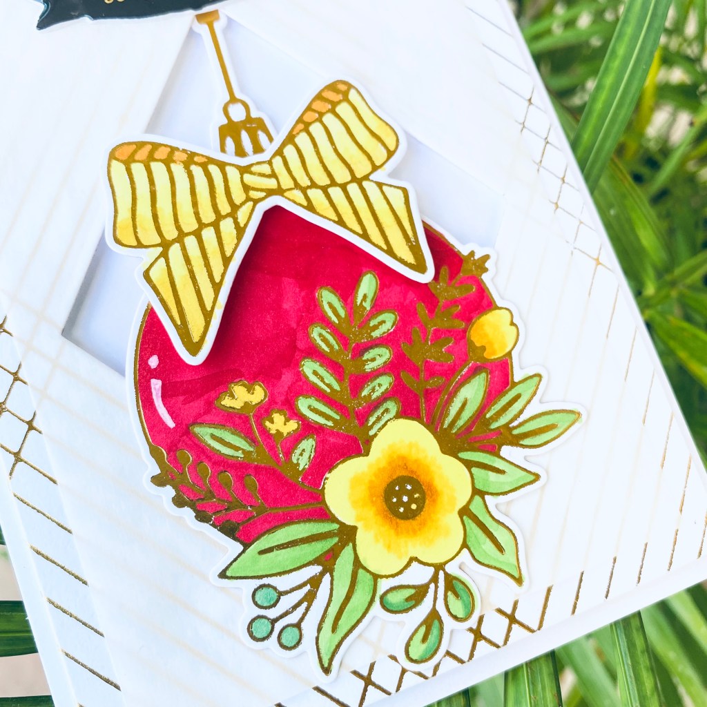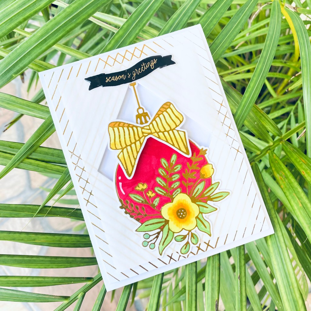 I hot foiled the Crossed Lines card front hot foil plate and Spellbinders Blooming ornament hot foil plate on white cardstock and colored the ornament pieces.