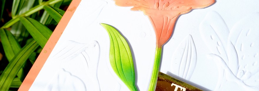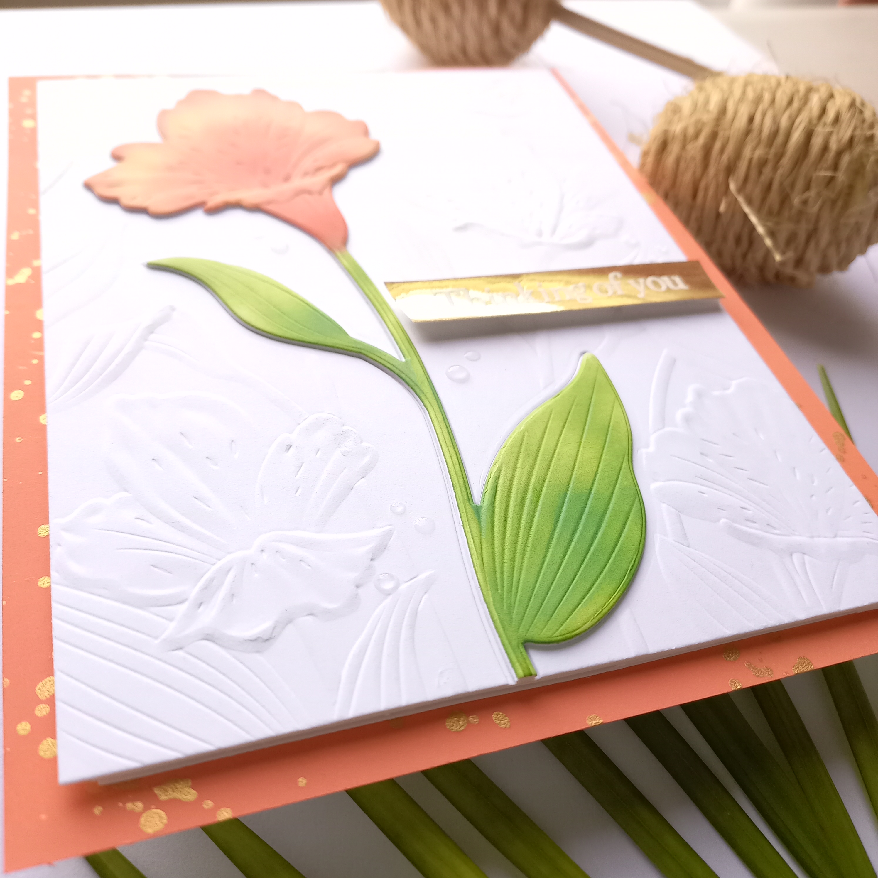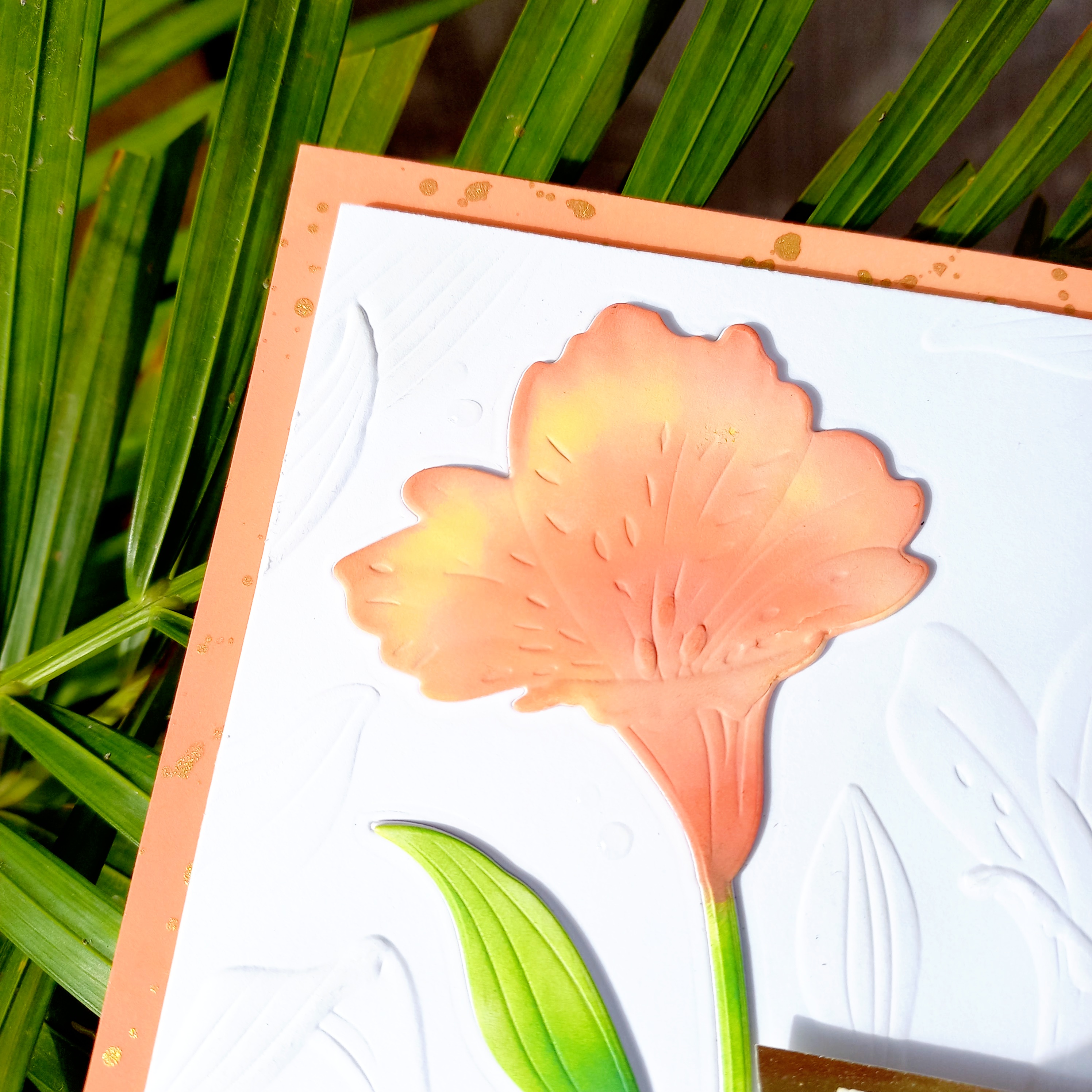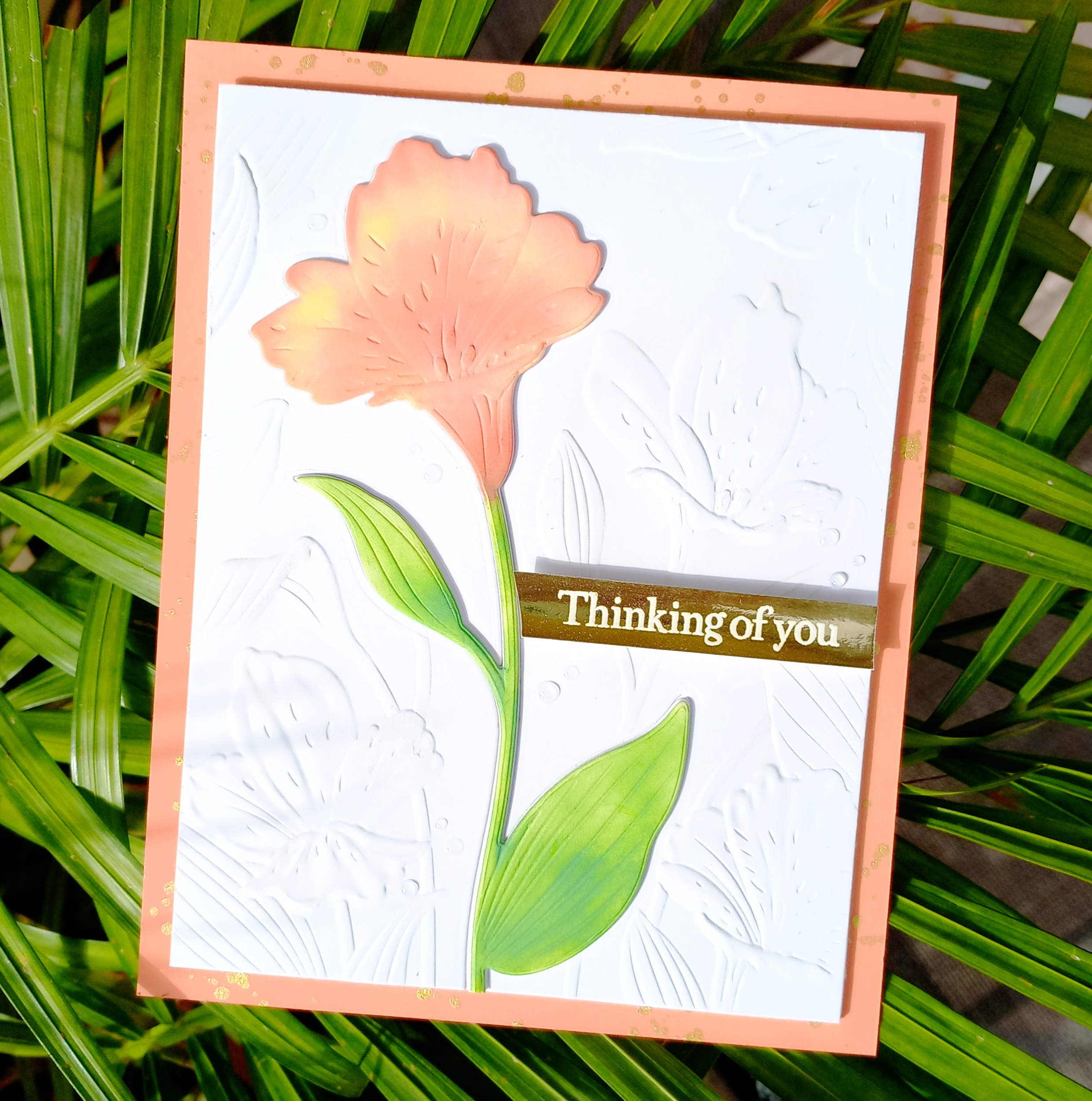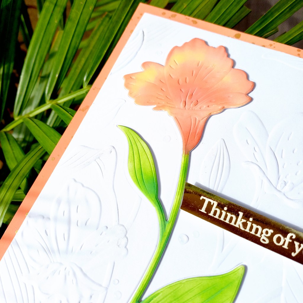 I do hope you are doing well. Today I am sharing a clean and simple card using the Alstroemeria Bunch embossing folder and cutting die. This folder leaves a very beautiful pattern when used and has the fun feature of a die which enables you to cut out a portion of your embossed piece or cut the silhouette of the flower for other projects.