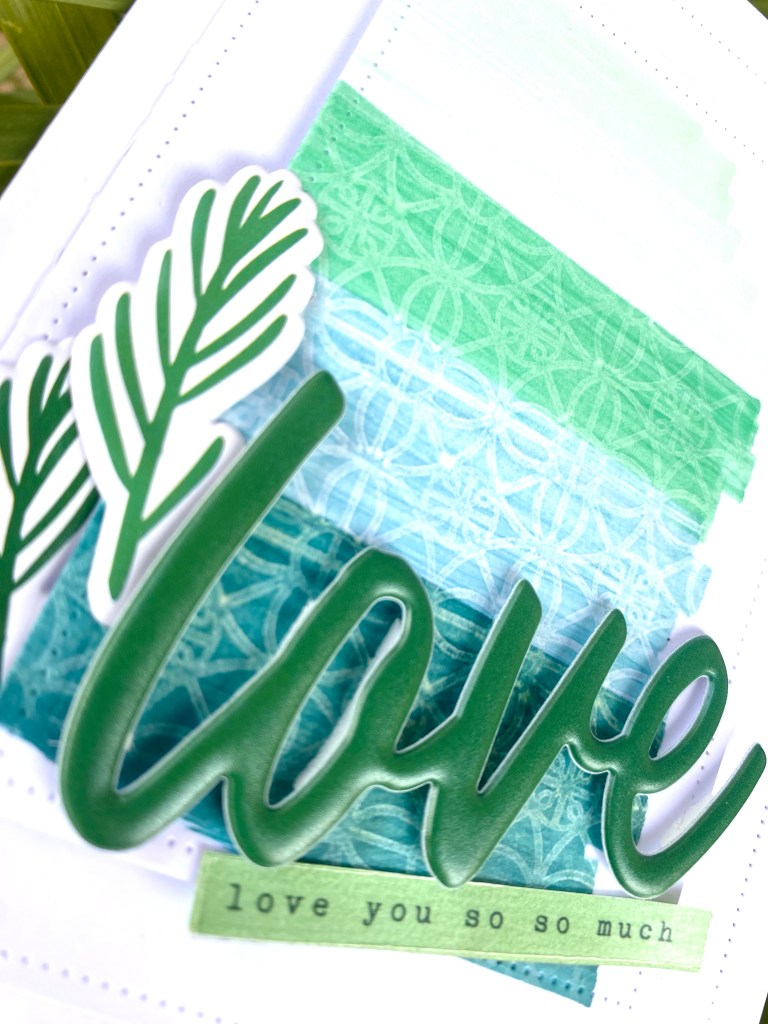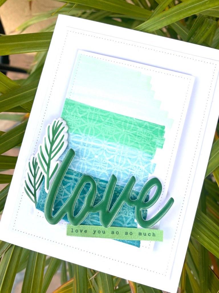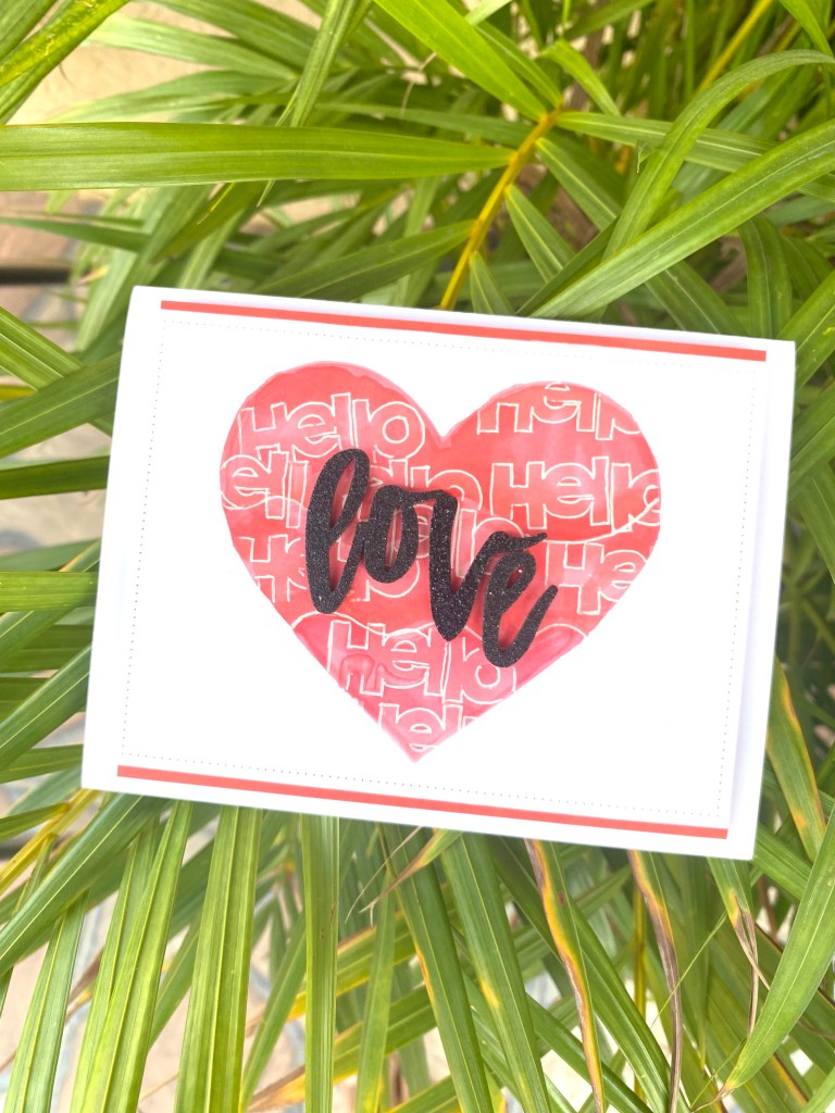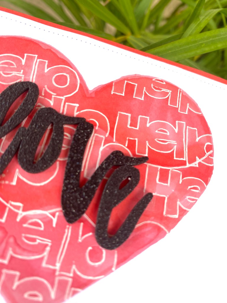 For this cute heart card I used the same technique but used marker with a stencil and used a white gel pen to outline the stamped word.