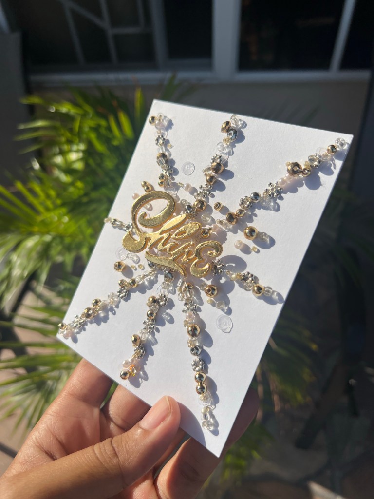 I threaded a needle and knot the thread before pushing through my first hole from the back of the card panel to the front. I then added beads to the needle and thread and pushed the needle back through the same hole to secure the beads.