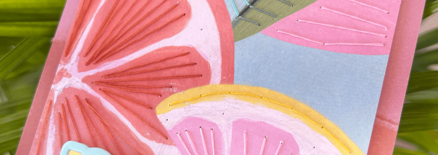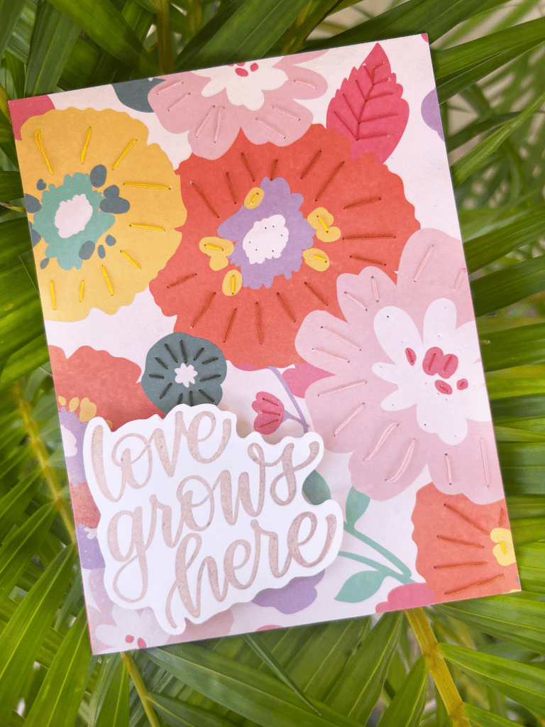 Here’s an easy way to add some interest to your pattern paper when making cards. Adding a little thread can be just enough to turn a plain printed background into something special.