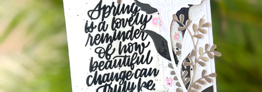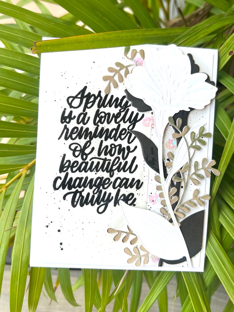 I stamped the greeting on vellum and cut the sides off to form a vertical strip. I then adhered that strip to the card front by folding the excess to the back of the card front and gluing it down. I added black splatters to the vellum. I then cut the flower from black and white cardstock. The white cardstock portion was embossed after cutting with the embossing folder. I cut the fiddly leaf die from silver cardstock and adhered small pieces to act as accents on the card. I adhered sequins and mounted the card front on a card base.