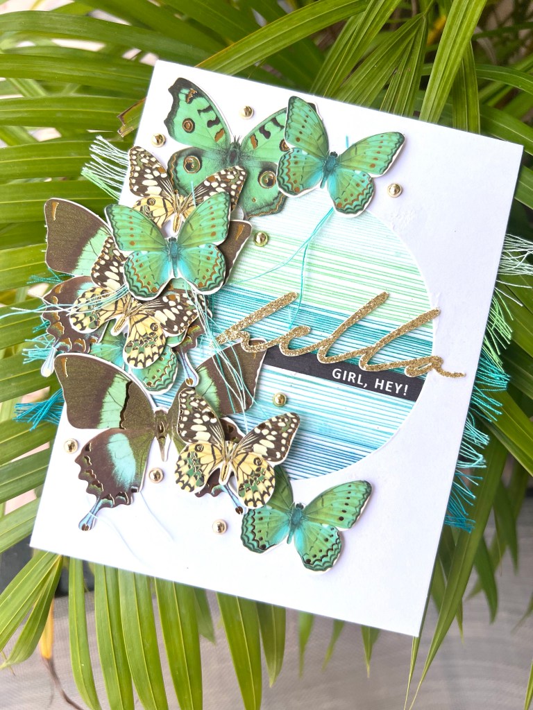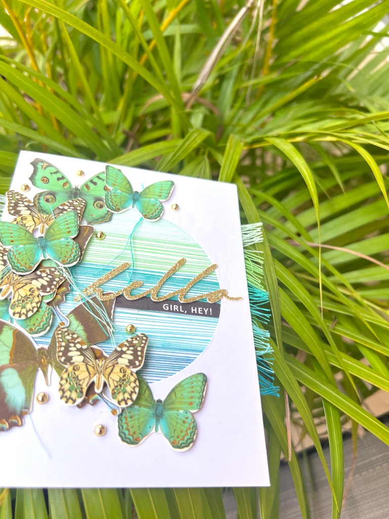I cut a circle in a card front and using double sided tape attached thread across the opening on the back till the circle was filled. I then adhered my butterflies with glue and some with foam tape to add some dimension. Under a few of the butterflies I placed some small pieces of hanging thread before glueing them down. I adhered the sentiments and then the gold flatbacks.